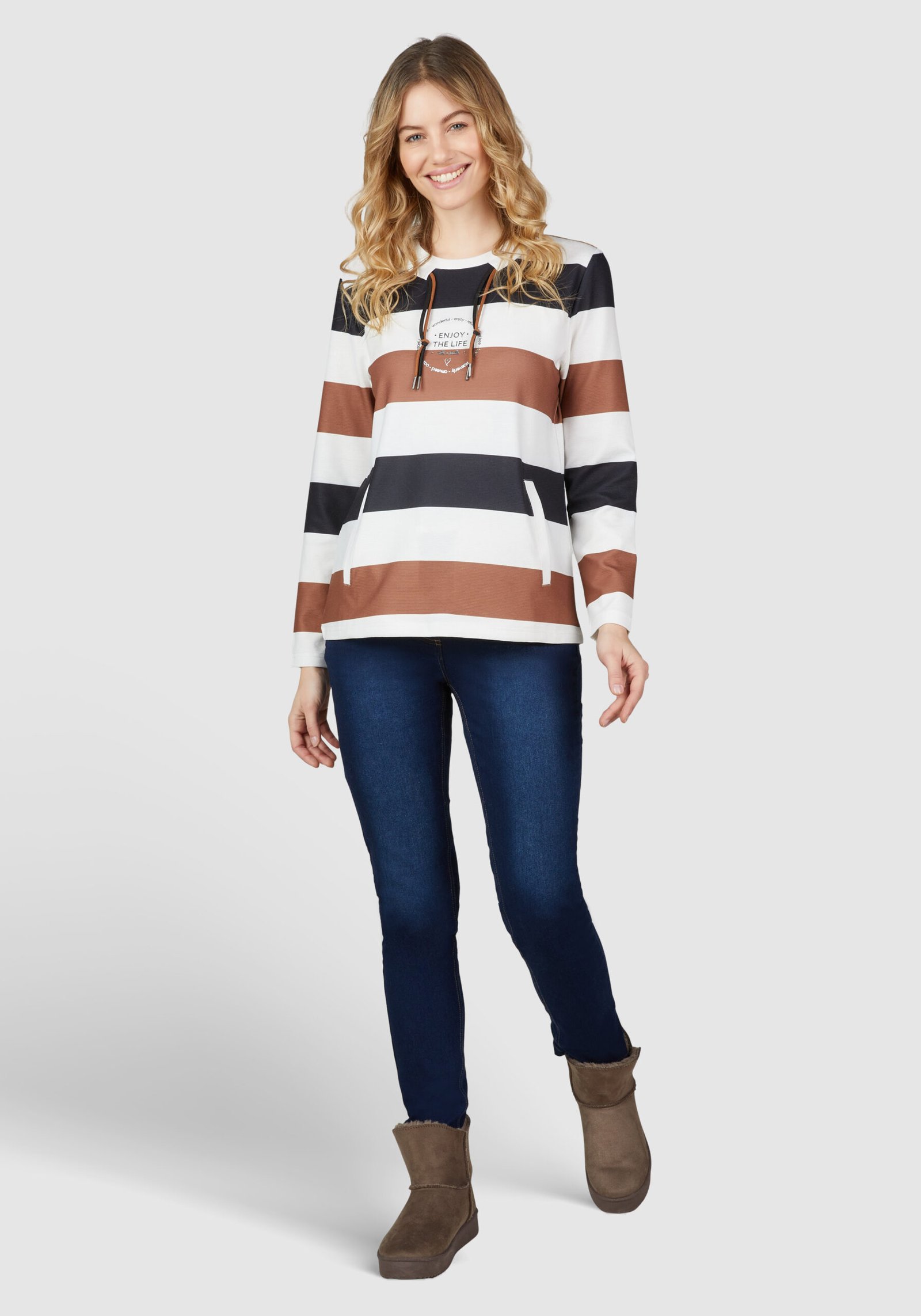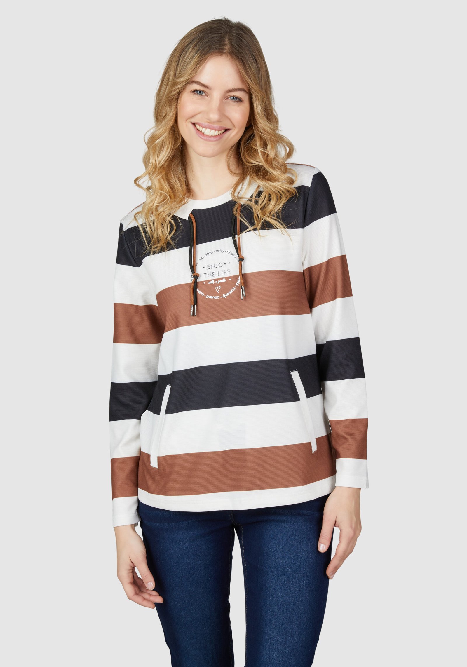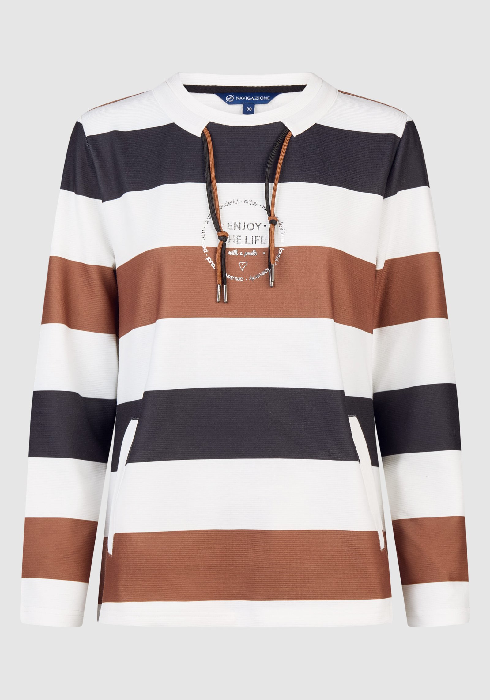 Setze ein modisches Statement mit diesem trendigen Pullover! Das markante Streifenmuster in klassischen Schwarz-, Braun- und Weißtönen macht den Pullover zu einem echten Hingucker. Der gemütliche Rundhalsausschnitt mit Kordel verleiht dem Design eine sportive Note, während der zentrale Schriftzug „ENJOY THE LIFE“ mit zusätzlichen kleinen Printdetails ein positives Lebensgefühl transportiert. Die weiche Materialmischung sorgt für angenehmen Tragekomfort – ideal für kühle Tage und entspannte Stunden.