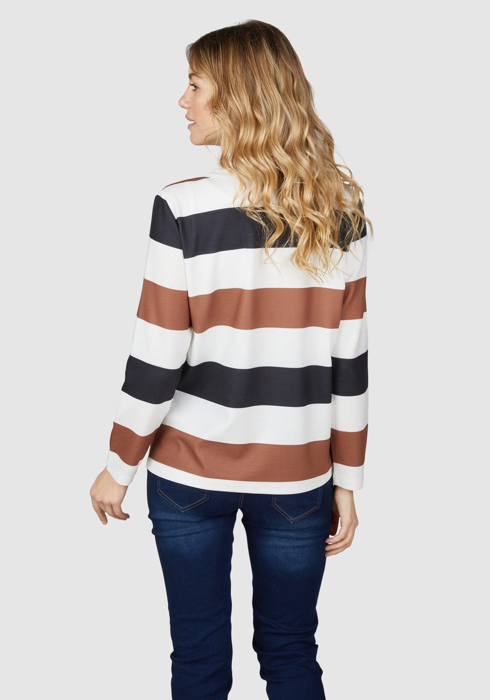 – Lässiger Damen-Pullover mit auffälligem Blockstreifenmuster in Schwarz, Braun und Weiß