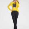 Das leuchtend gelbe Oberteil mit schwarzen Druckelementen ist der ideale Begleiter für diese Hose. Es bringt Farbe in Ihr Outfit und hebt Sie stilvoll von der Masse ab. Kombiniert mit schwarzen Lederstiefeln entsteht ein harmonischer Look, der Professionalität und Modernität vereint.