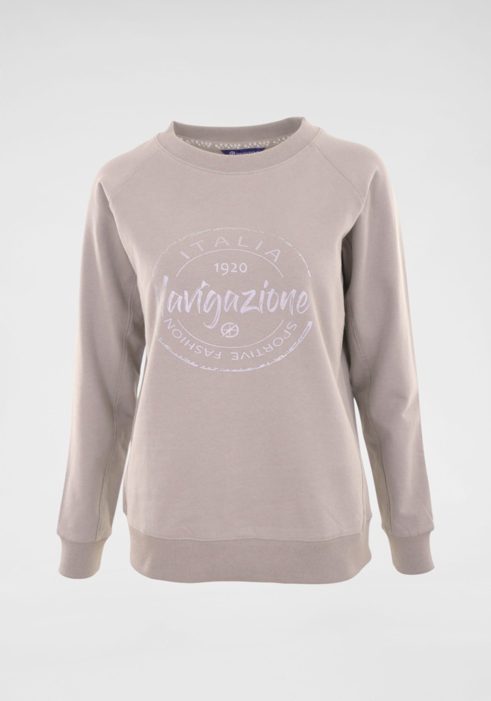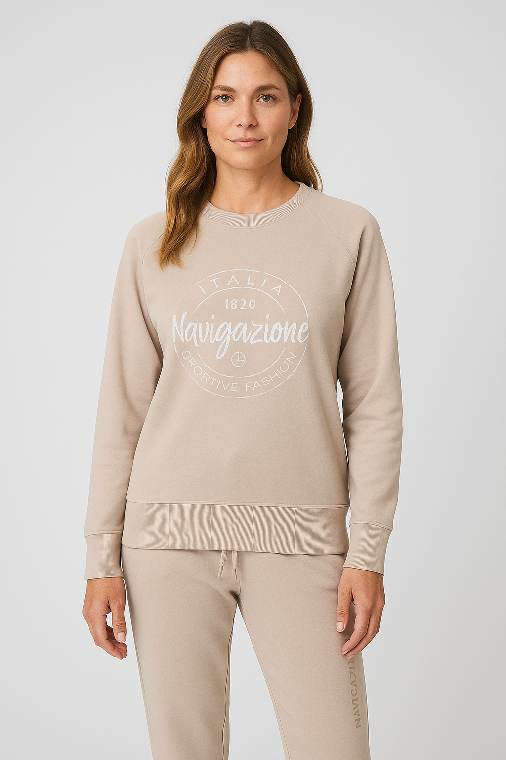 Dieses Sweatshirt vereint italienisches Flair mit sportlicher Eleganz. Das dezente Beige und der auffällige, kreisförmige Frontprint mit dem Schriftzug „ITALIA 1920 Navigazione – Sportive Fashion“ machen das Oberteil zu einem echten Hingucker. Die soften Materialien und der bequeme Schnitt sorgen für höchsten Tragekomfort im Alltag, beim Spaziergang oder auf Reisen. Die gerippten Bündchen und der klassische Rundhalsausschnitt garantieren einen optimalen Sitz und verleihen dem Sweatshirt eine hochwertige, moderne Optik.